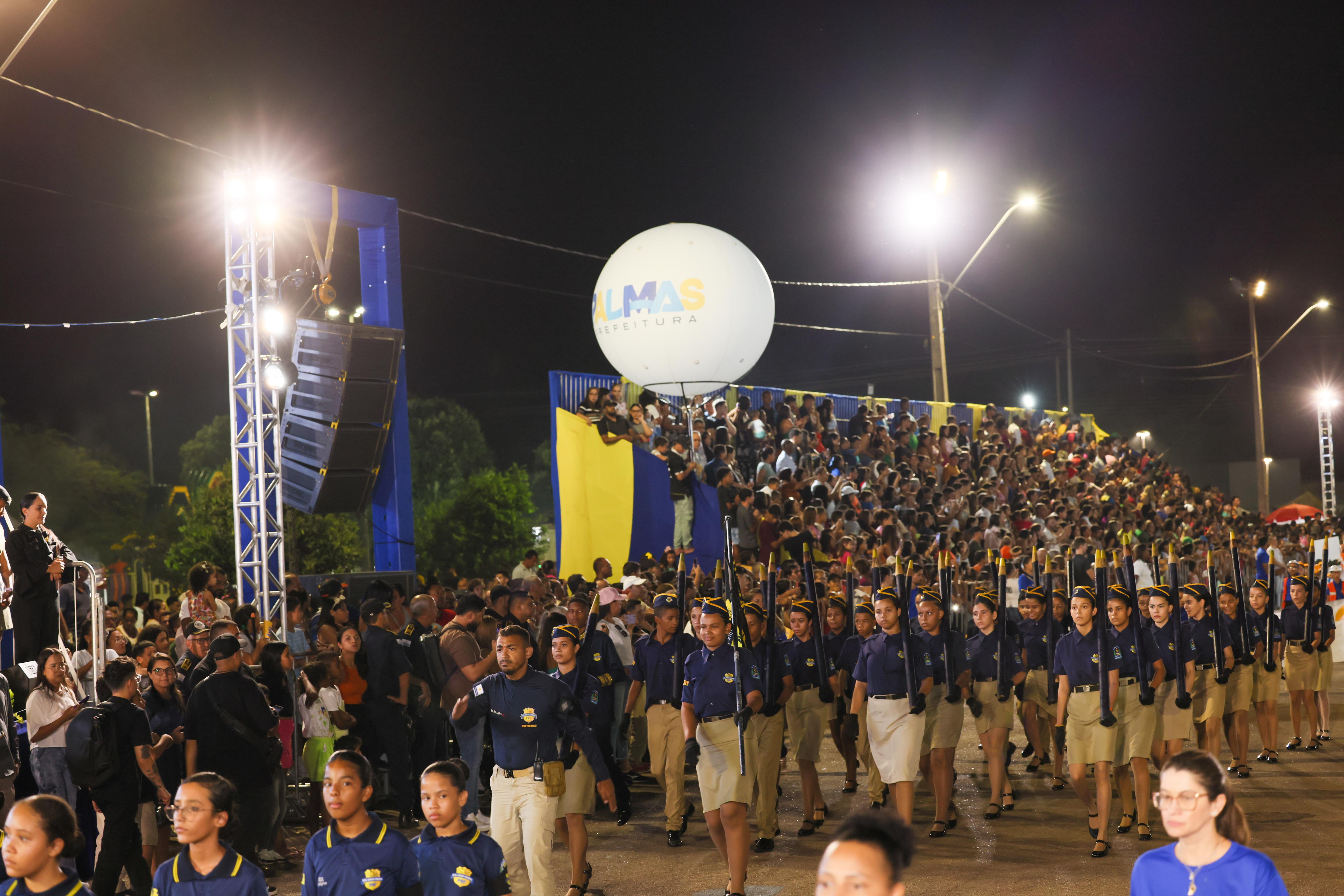 Para homenagear a jovem Capital de apenas 36 anos, a Prefeitura de Palmas, por meio da Secretaria Municipal da Educação (Semed), realizou, na tarde desta terça-feira, 20, o tradicional desfile cívico e militar, que retornou à região sul da Capital, ao lado do Ginásio Ayrton Senna, em Taquaralto. Um dos momentos marcantes do desfile ficou por conta da Escola de Tempo Integral (ETI) Almirante Tamandaré, com uma ala composta por sete crianças representando os ex-prefeitos e ex-prefeitas da Capital.