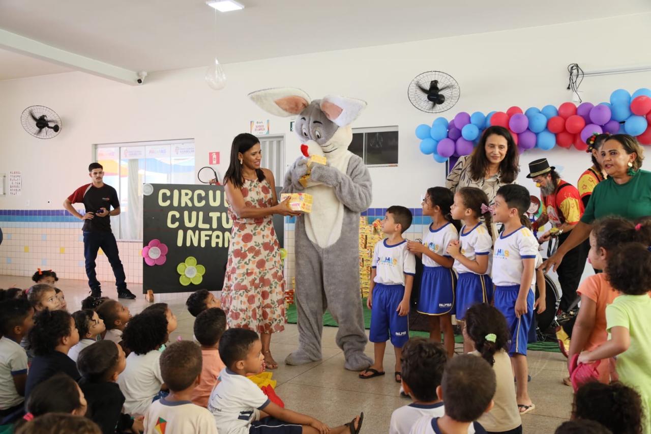 A magia da Páscoa tomou conta do Centro Municipal de Educação Infantil (CMEI) Juscéia Garbelini, no setor Santo Amaro, na última quinta-feira, 17. E o motivo foi uma visita para lá de especial: o prefeito Eduardo Siqueira Campos trocou o paletó pela fantasia de coelho da Páscoa e apareceu com um sorriso largo, orelhas felpudas e as patinhas cheias de chocolate, distribuindo caixas de bombons para as 282 crianças.