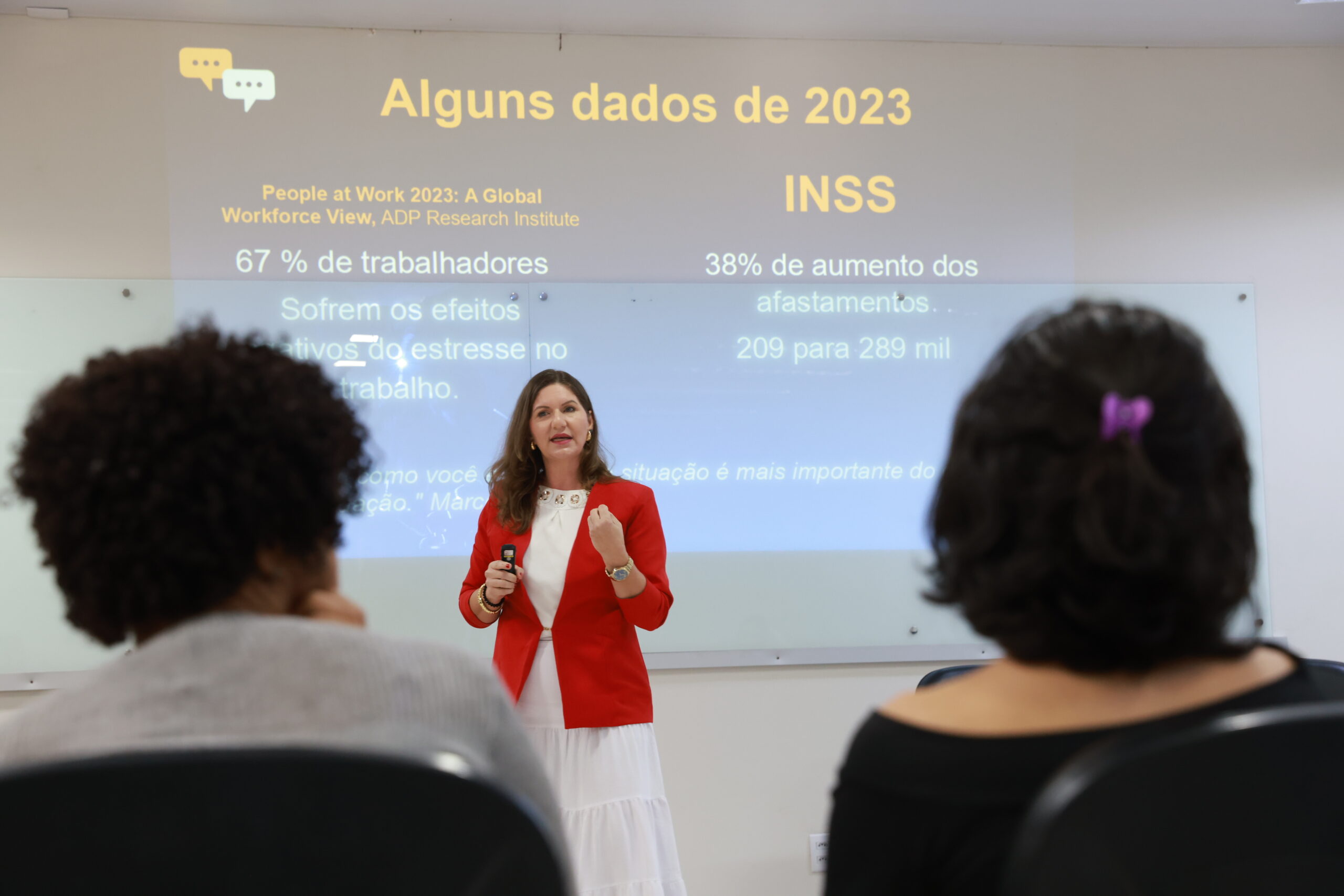 Em seguida, o coordenador do Viva Bem Servidor (VBS) e servidor Kaique Hilário conduziu um momento de relaxamento por meio de práticas de yoga e meditação antes da palestra principal, quando a servidora da GMP Letícia Walker Bordin falou sobre 'Gerenciando o Estresse e a Ansiedade no Ambiente de Trabalho'.