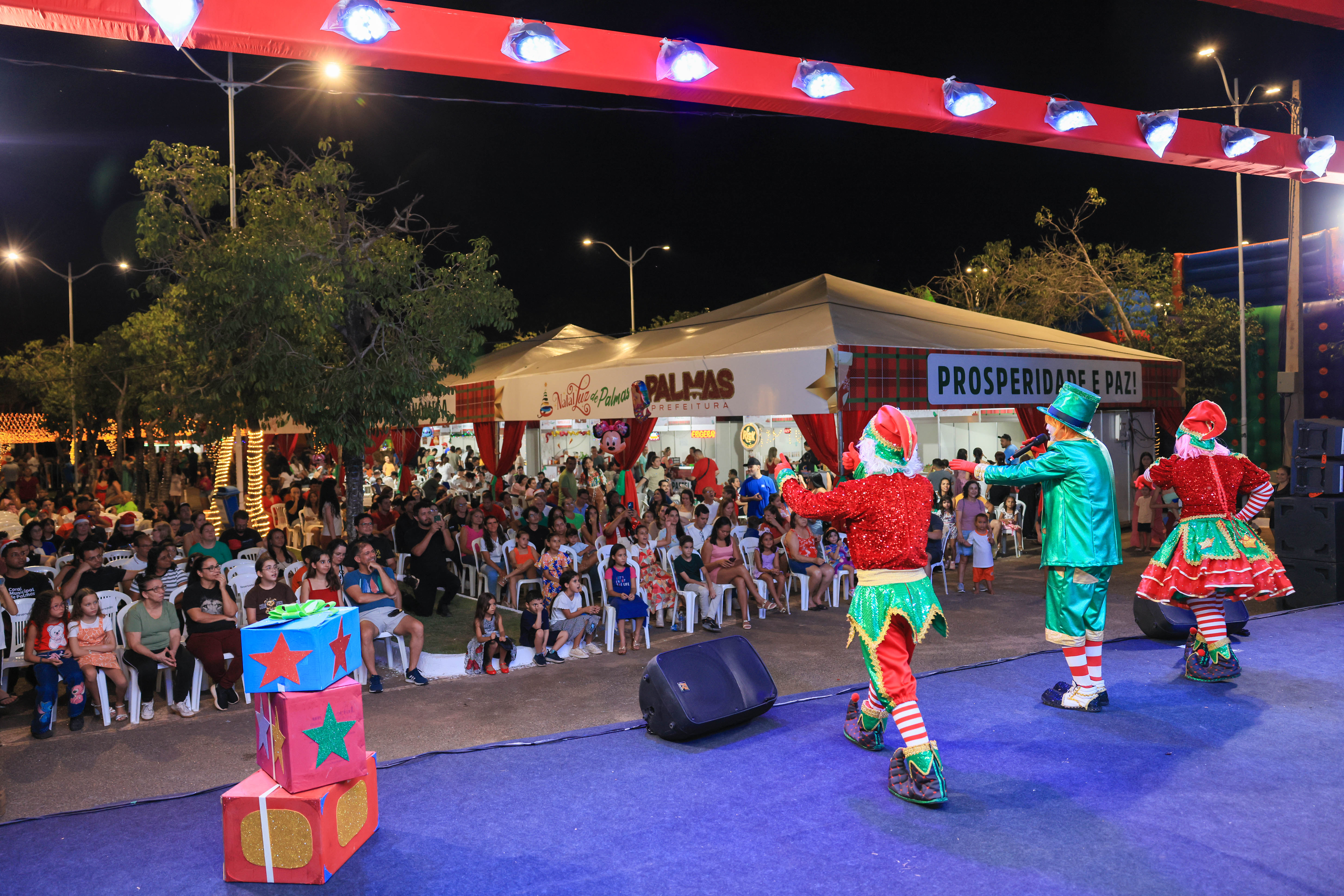 A noite de abertura contou também com uma série de apresentações culturais. O Coral Vozes Encantadas da ETI Padre Josimo, o Coral Municipal de Palmas e a Orquestra da Guarda Metropolitana subiram ao palco, interpretando canções natalinas. Personagens temáticos circularam entre o público, como o carismático Palhaço Batatinha, que arrancou risadas das crianças.