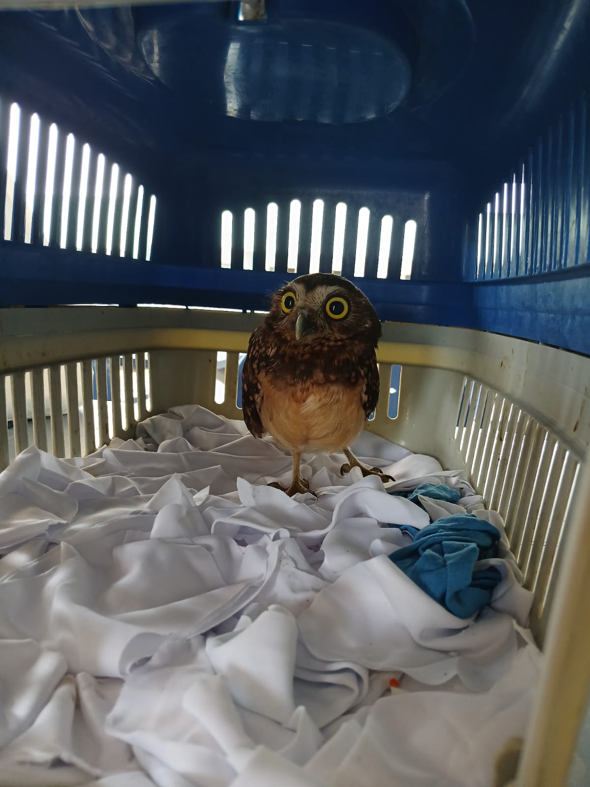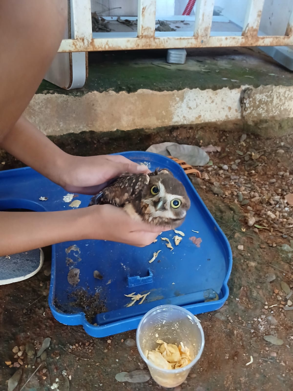 Recentemente, uma nova ninhada de corujas trouxe quatro filhotes. Ainda aprendendo a voar, eles permaneciam próximos ao chão, realizando voos curtos e ficando, muitas vezes, na porta da sala de aula, circulando normalmente em alguns espaços da escola. Foi nesse período delicado que um dos filhotes acabou sendo atingido por uma pedra lançada por uma criança. A coruja não morreu, mas ficou paralisada e bastante debilitada.