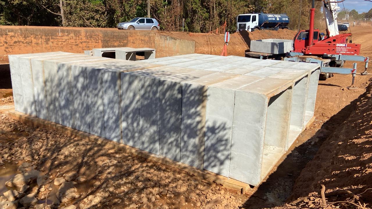 A obra de requalificação viária que liga a Avenida NS-15 aos bairros da região norte da Capital segue avançando com a construção do bueiro triplo celular sobre o córrego Água Fria. Nesta etapa da obra, executada pela Prefeitura de Palmas, estão sendo instaladas aduelas de concreto com dimensões de três metros, que vão garantir a canalização eficiente das águas do córrego, fundamental para a infraestrutura da nova via.