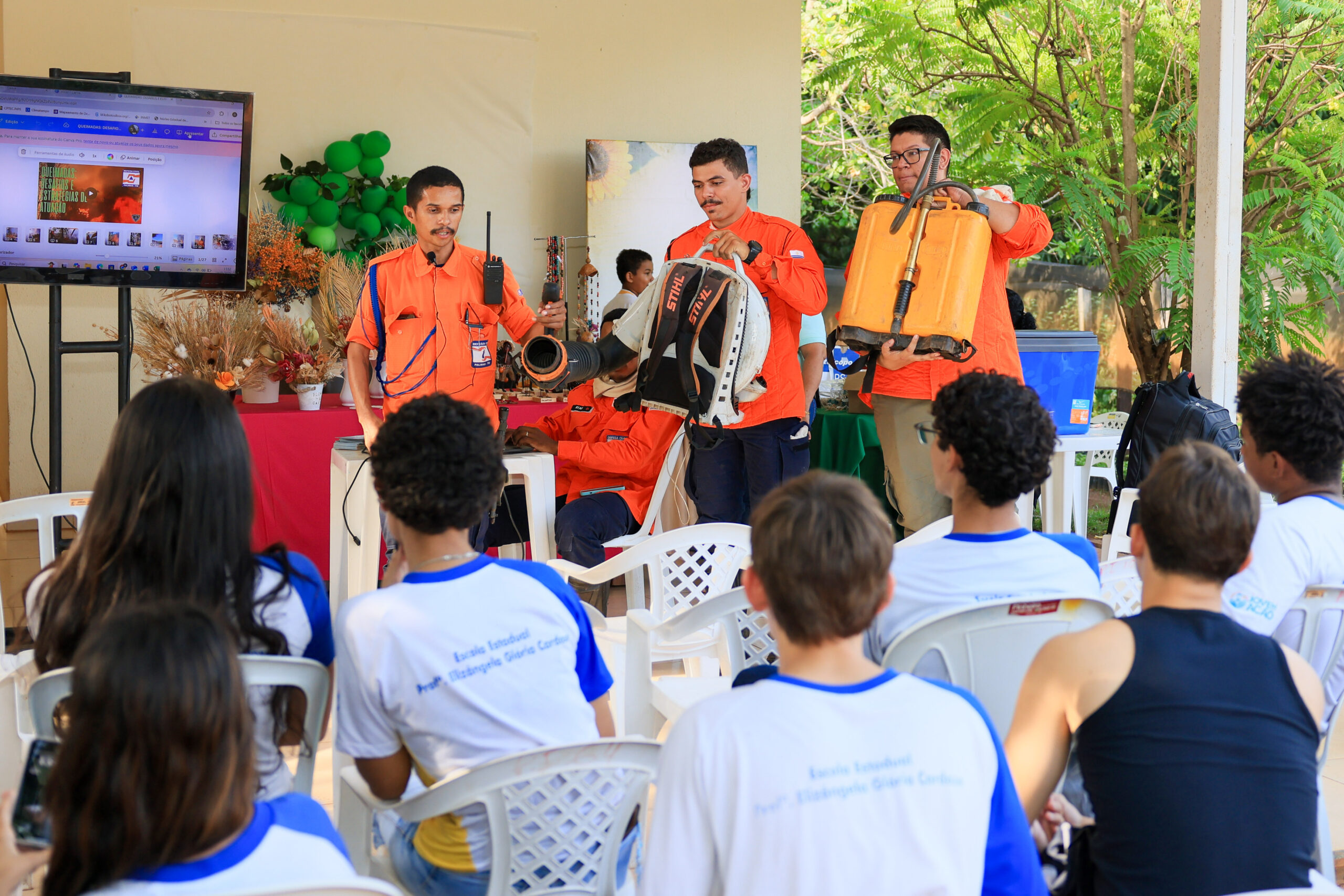 Alunos das redes municipal e estadual de ensino e da Universidade da Maturidade (UMA) participaram de palestra com a Defesa Civil Municipal, que abordou a prevenção às queimadas. As crianças realizaram também uma trilha guiada pelo Viveiro e visitaram os estandes da Secretaria Municipal de Saúde (Semus) e Secretaria Municipal do Bem-Estar Animal (Sebem).