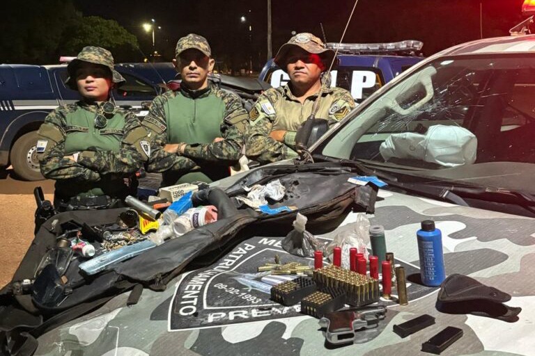 Durante a abordagem, foi constatado que o indivíduo apresentava sinais de embriaguez, como desorientação, fala desconexa e odor etílico. Em sua mochila, foram localizados diversos itens ilícitos: uma pistola calibre 6.35 mm, dois carregadores, 56 munições calibre 22, 66 munições calibre 38, munições de calibres 22 e 28, além de dois potes de pólvora (branca e preta), duas garrafas de bebida alcóolica quebradas, uma motosserra e um aparelho celular.
